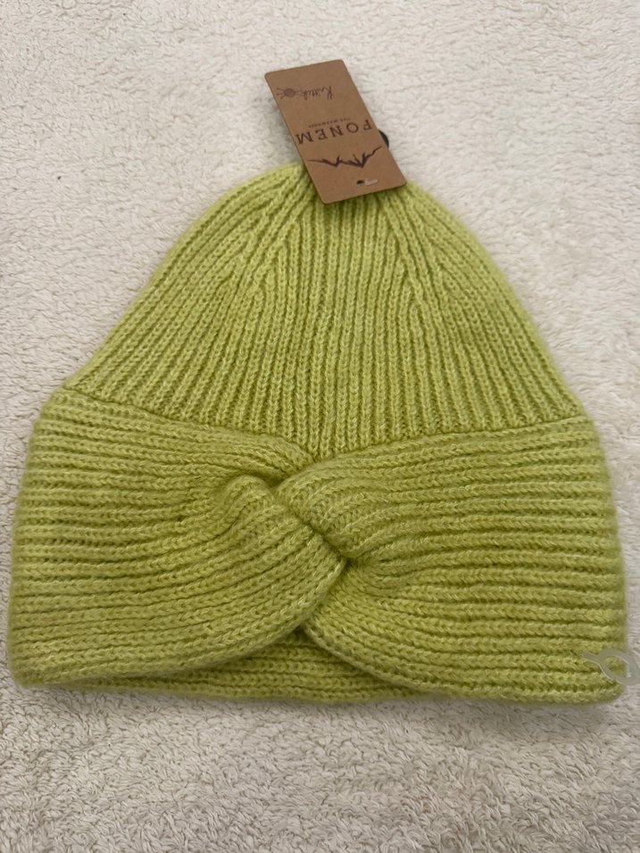 Pastel yeşil renkli, örgü yapıda, yumuşak kumaştan yapılmış, rahat ve sade bohem tarzda kadın bere.