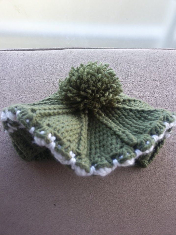 Yeşil renkli, üzerinde ponpon bulunan örgü kadın bere. Beyaz ince kenar detayı ile sıcak ve rahat bir dokunuş sunar.