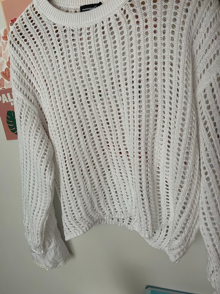 Beyaz örgü triko kazak, uzun kollu ve yuvarlak yakalı, rahat kesimiyle günlük sokak stiline uygundur. Nefes alabilen kumaşı konfor sağlar.