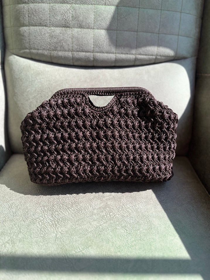 Kahverengi örgü dokusuyla kadın çanta, bohem tarzda ve günlük kullanıma uygun sade tasarıma sahiptir. Polyester makrome ile örüldü burslu modeldir