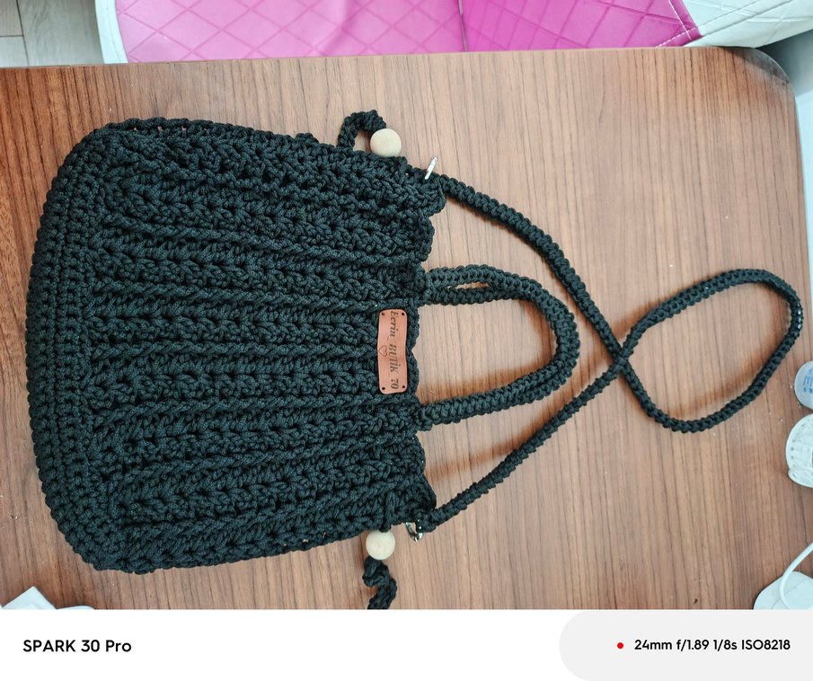 siyah renkte, örgü kadın çanta. Örgü kumaştan yapılmış, rahat ve bohem tarzda, günlük kullanım için uygun. içi astarlı çıtçıtlıdır 25en 20cm boy