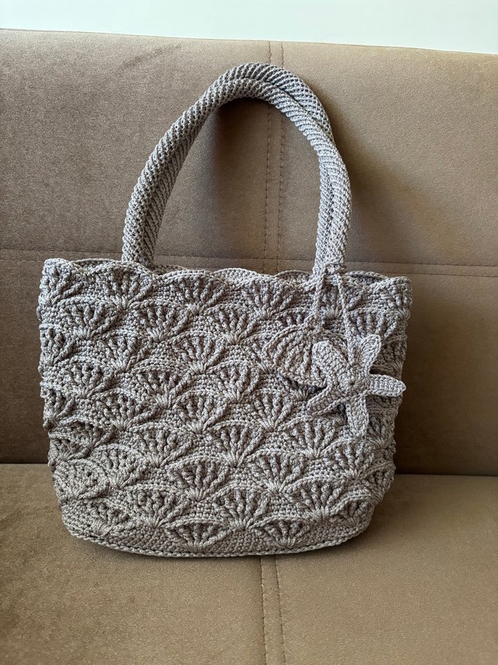 Hazır tabanlı, astarlı, çıtçıtlı, toprak gri renginde, şık ve kullanışlı, sağlam, el örgüsü omuz/el çantası. Boyutları; en 25cm, boy 13cm ve yükseklik 21cm. Bej renkli, örgü dokulu kadın çantası. Bohem tarzda, örgüden yapılmış yıldız aksesuarı ile günlük kullanıma uygun yumuşak dokulu çanta.