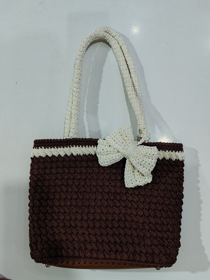 Örgü kahverengi gövdeye sahip, beyaz saplı ve süslü beyaz fiyonk detaylı kadın çantasıdır.