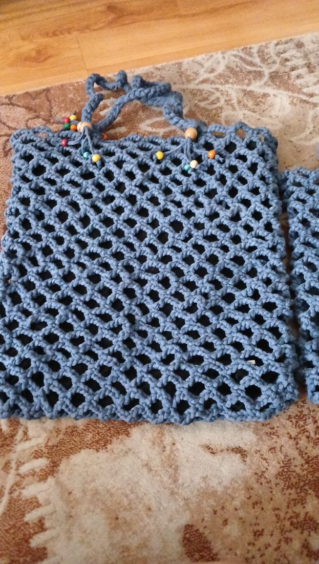 Bohem tarzda, yumuşak ve rahat dokuda gri-mavi örgü kadın çanta. Renkli boncuklu kulpları ve açık örgü deseni ile günlük kullanıma uygundur.
