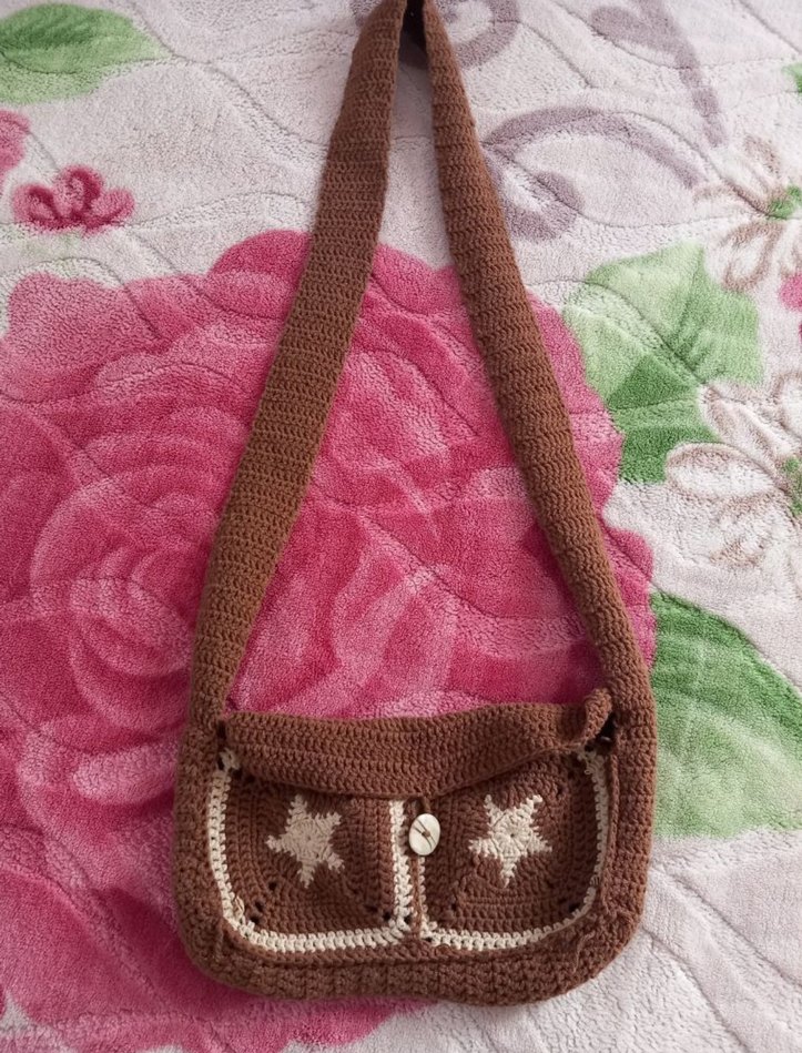 Kahverengi, örgü kadın çanta, yıldız desenli ve düğmeli, rahat ve bohem tarz için uygundur.