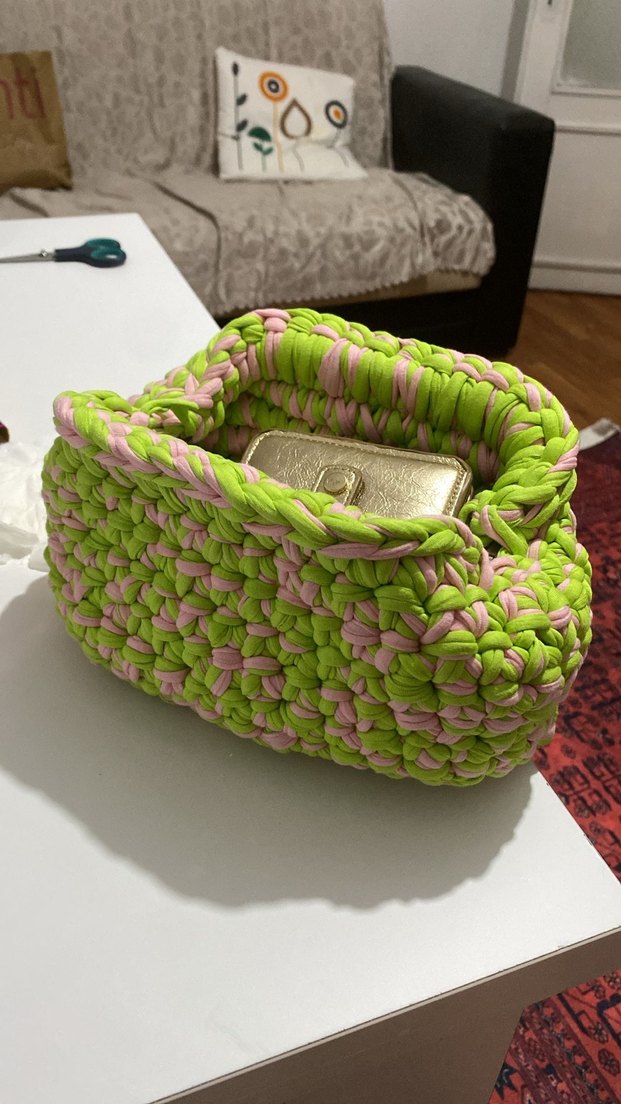 Bu kadın çantası, yeşil ve pembe tonların birleştiği renkli örgü tasarıma sahiptir. Rahat, bohem tarzıyla günlük kullanıma uygundur ve canlı dokusuyla dikkat çeker.