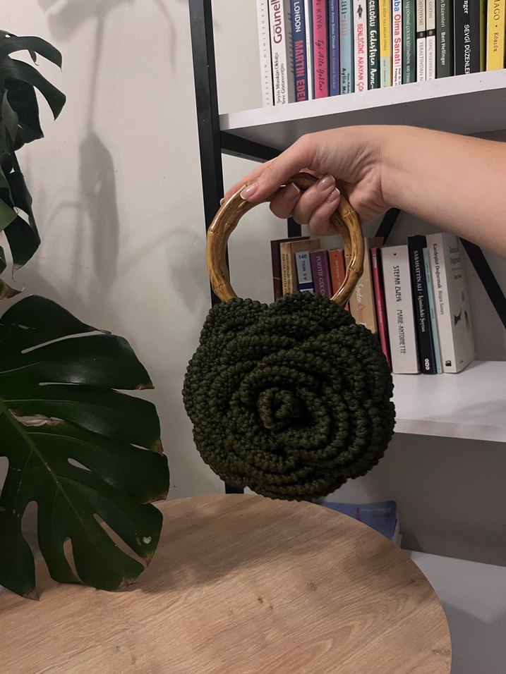 Koyu yeşil renkte, örgü çiçek deseni ve ahşap saplı, bohem tarzına uygun rahat bir kadın çantası.