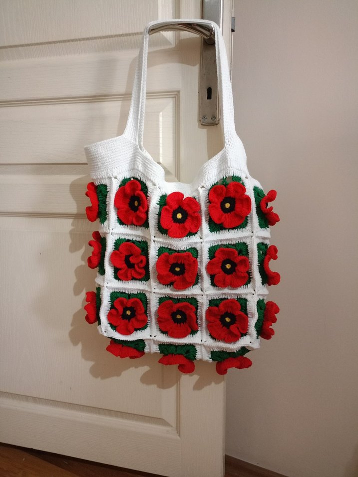 gelincik çiçeği motifli beyaz,örgü kadın çantası, günlük kullanım için uygun genişlik 40 cm derinlik 39 cm kol askısı yüksekliği 22 cm dir #örgüçanta #kolçantası #çiçekliçanta #alize #kartopu #yarnarts