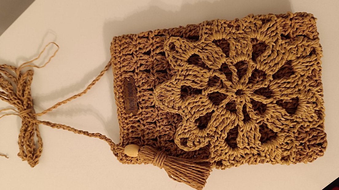 Nakışlı detaylara ve püsküle sahip kahverengi örgü çapraz çanta, bohem tarzını yansıtıyor. Günlük kullanım için uygundur.