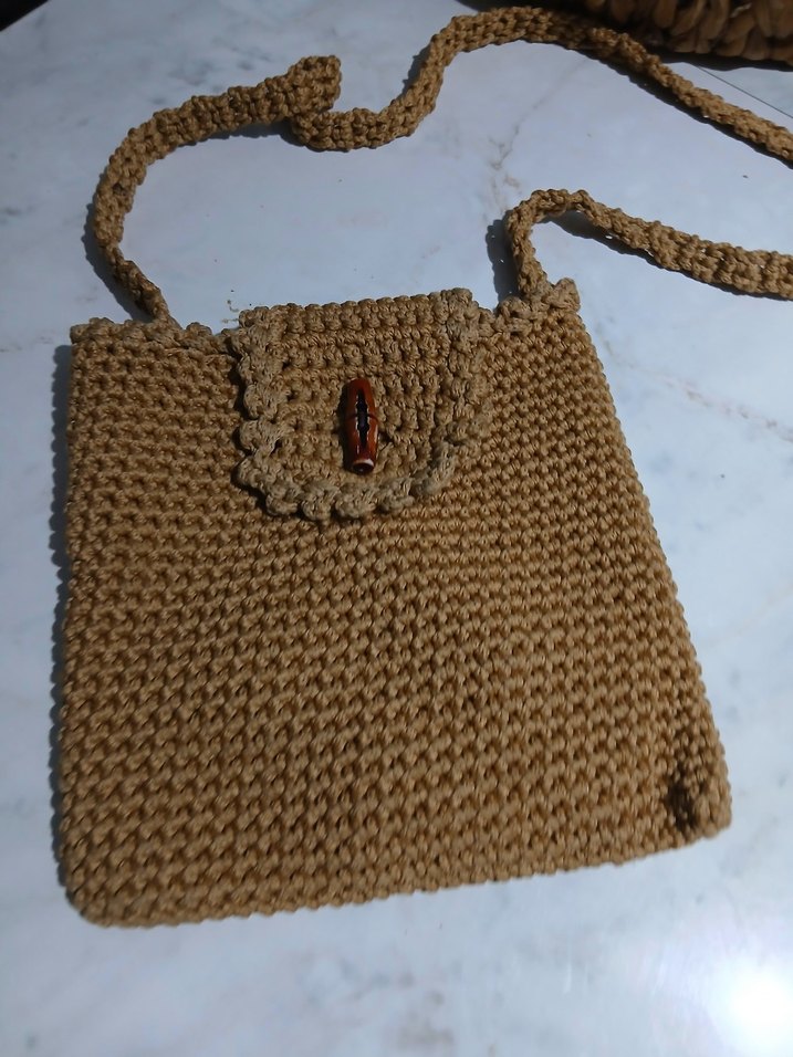 Hafif kahverengi, yumuşak dokulu örgüden yapılmış kadın çapraz çanta. Düğmeli kapak ve uzun örgü askısı bulunur. Bohem tarzda, günlük kullanıma uygun. 20 cm uzunluk ve enı el emegıdır tıgla öruldu
