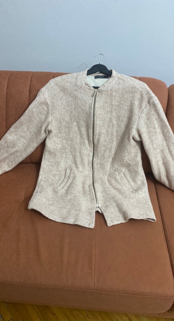 Pudra pembe gibi renkli, örgü dokulu kadın ceket, rahat kesim ve uzun kolludur. normal boyda ve kesik yakalıdır, günlük kullanım için uygundur.