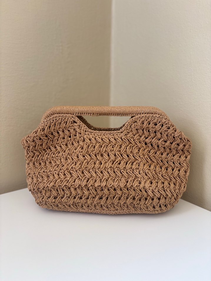 Bej renkli, örgü dokulu ve bohem tarzda kadın mango clutch çanta.