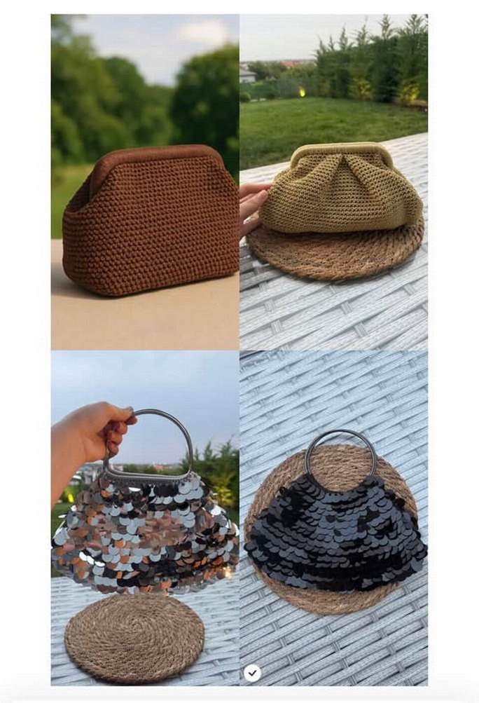 Örgü malzemeden yapılmış, bohem tarzda kadın clutch çantalar. Kahverengi, bej ve gri tonlarda, desen içermeyen, günlük kullanıma uygun. ADET 500 ₺