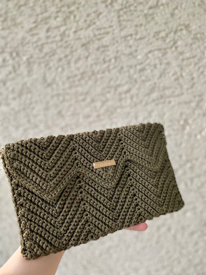 Haki renkli, örgü kumaştan yapılmış kadın el çantası. Sade ve bohem tarzda, günlük kullanıma uygun rahat dokusu bulunur.
