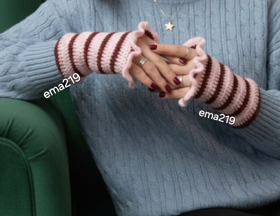 GÖRSEL BANA AİTTİR ✔️ İLAN AÇIYORUM ✔️ Pembe bordo çizgili örgü kadın eldivenleri, fırfırlı kenarlarla rahat ve bohem bir tarz sunar. Retro ve karşı kültür stiline uygundur. ✨️