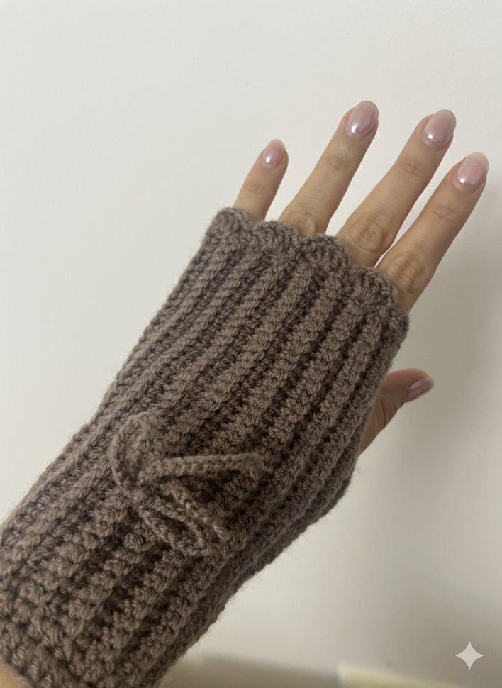 Bej renkte, örgü yapıda, açık parmaklı kadın eldiveni. Bohem tarzda, rahat ve sıcak tutar.