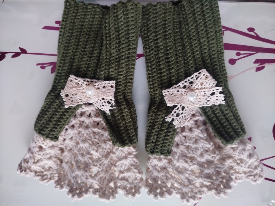 Açık haki renkte, dantel ve fiyonk detaylı örgü kadın eldivenleri. Rahat ve bohem tarzda, nostaljik bir görünüm sunar.