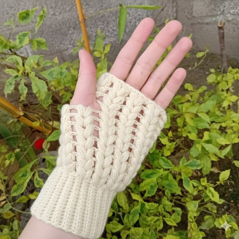 Bohem tarzda, açık örgü desenli beyaz kadın eldiveni. Rahat ve retro-hippi stil için uygundur.