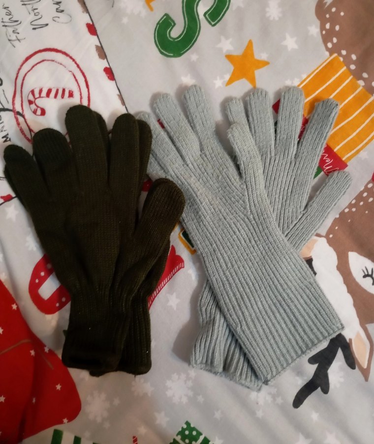 Gri ve koyu yeşil renklerde, örgü dokulu kadın eldivenleri, sokak stili ve rahatlık sunar. Soğuk günler için uygundur.