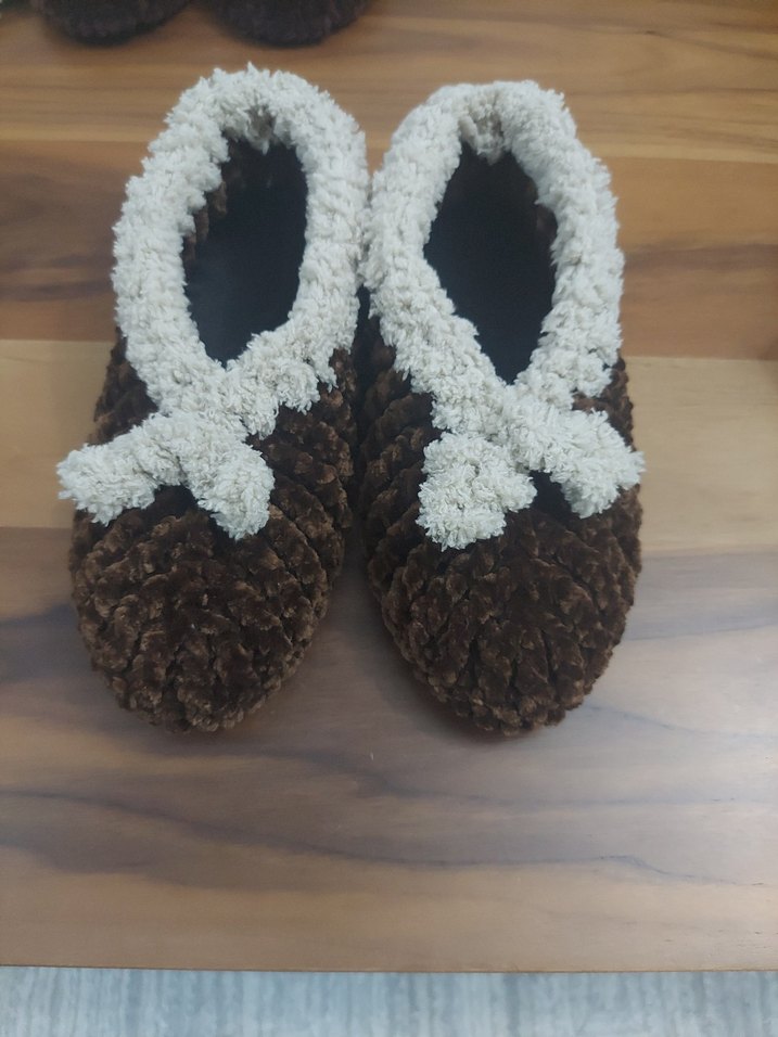 Kahverengi örgü kadın ev terliği, kama topuklu ve rahat tasarımlı. Günlük kullanım için bohem stilinde, dokulu örgü deseniyle.