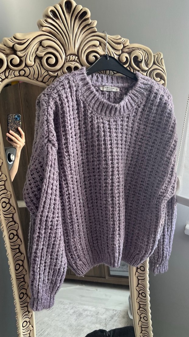 Mor , uzun kollu, yuvarlak yakalı ve bol kesim örgü kadın kazak, rahat ve gündelik kullanıma uygundur. Desensiz ve midi boydadır.