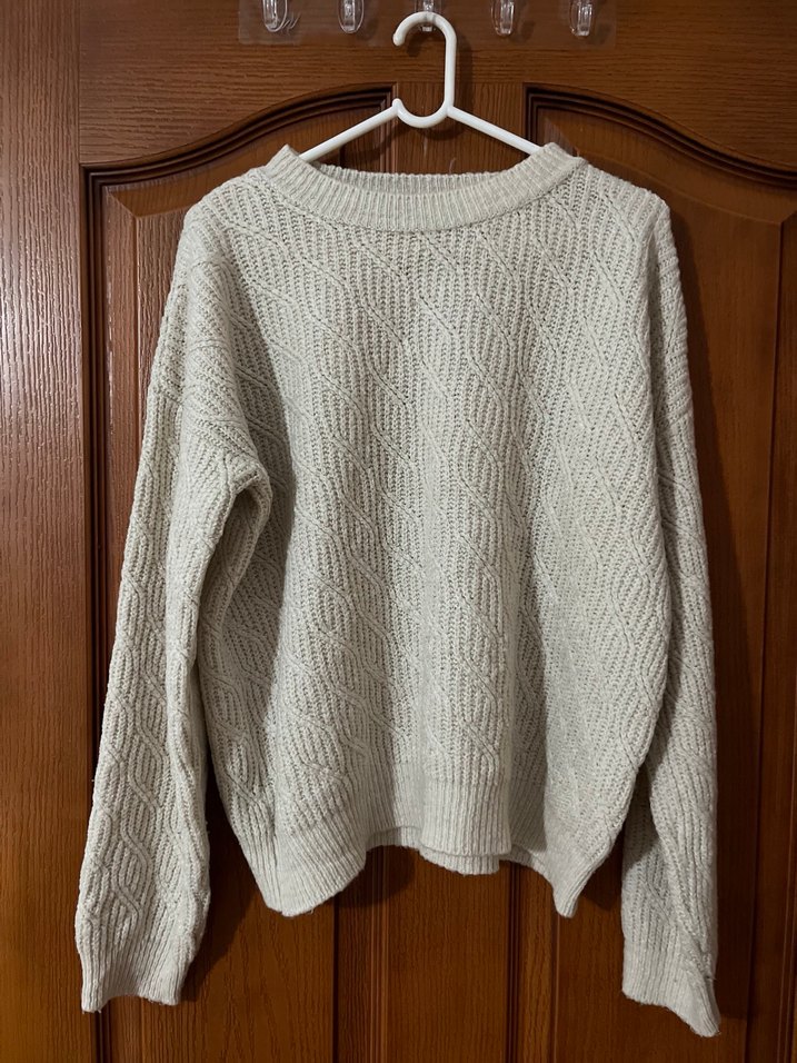 Bej renkli, örgü kadın kazak, uzun kollu ve yuvarlak yaka. Trendyolmilladan aldım kolları kısa geldiği için satıyorum fotoğraftaki gibi tüylenme vardır