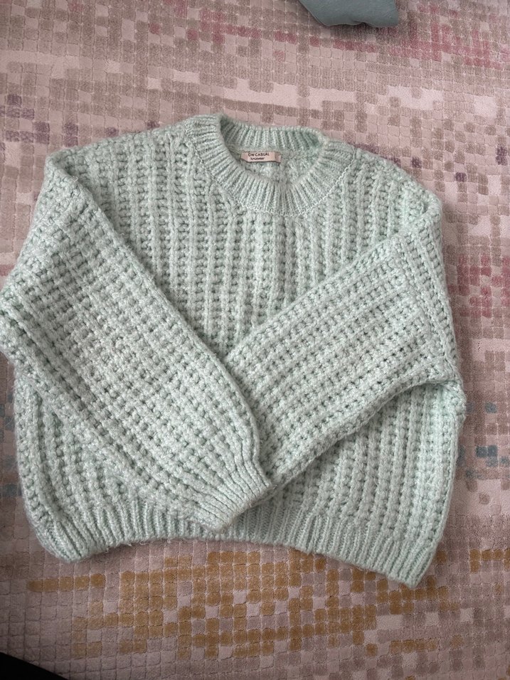 su yesili, örgü örme kadın kazak, yuvarlak yaka ve uzun kollu. Rahat kesimli, normal boyda, yumuşak örgü kumaştan üretilmiş, günlük kullanıma uygun.