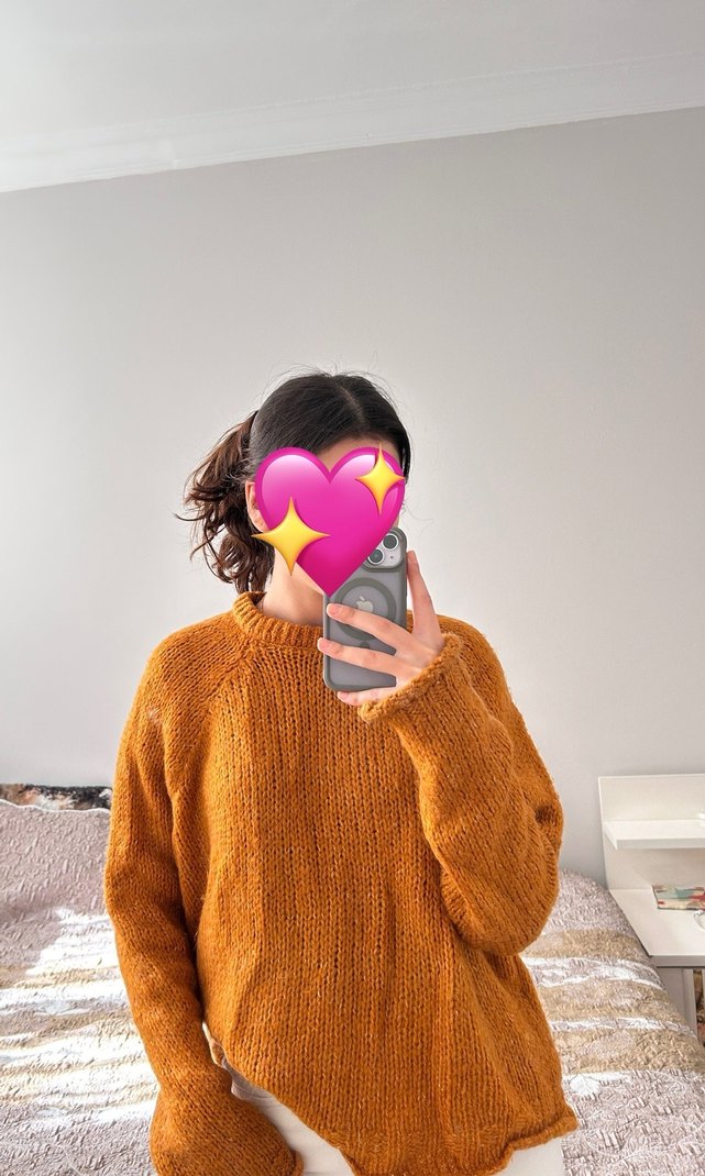 hardal rengi, örgü kumaştan yapılmış, salaş kesim ve bisiklet yaka detaylı kadın kazak. Uzun kollu ve normal boydadır, günlük kullanıma uygundur.