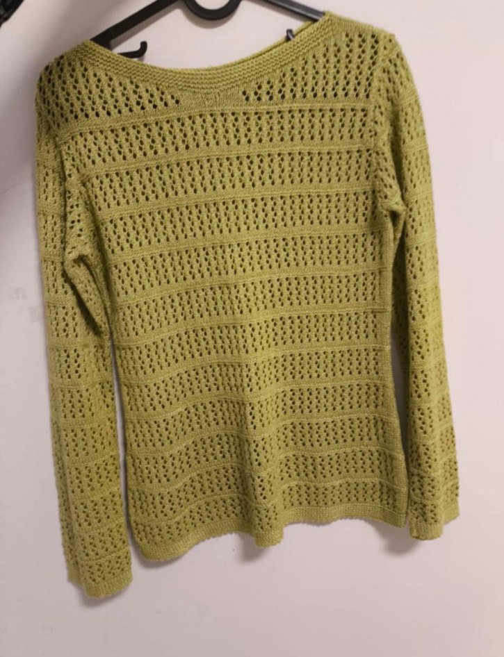 Yeşil renkli, örgü kadın kazak, yuvarlak yaka ve uzun kolludur. Salaş kesimi ve sade deseniyle günlük kullanıma uygun, rahat bir bohem tarz sunar.