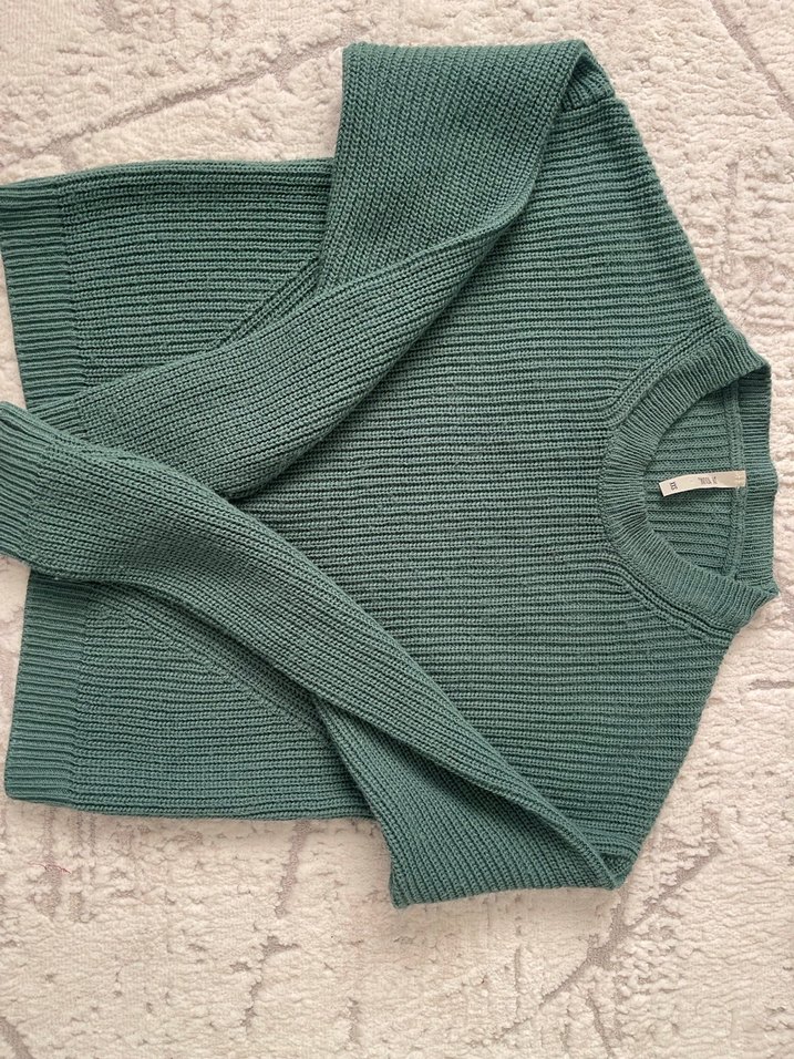uzun kollu, örgü kadın kazak. Normal boyda, rahat kesim ve düz tasarıma sahiptir. Günlük kullanıma uygundur.