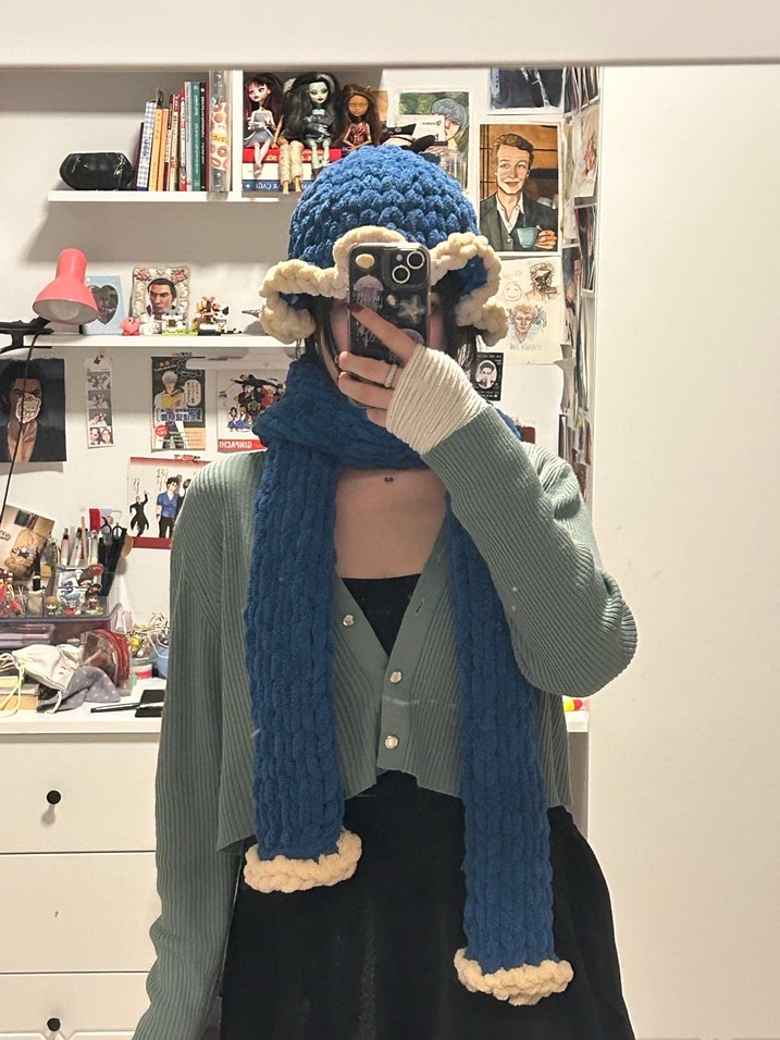 Krem rengi kenar detaylı koyu mavi örgü bere ve atkı seti, yumuşak ve rahat dokusuyla bohem ve retro tarzlara uygundur.