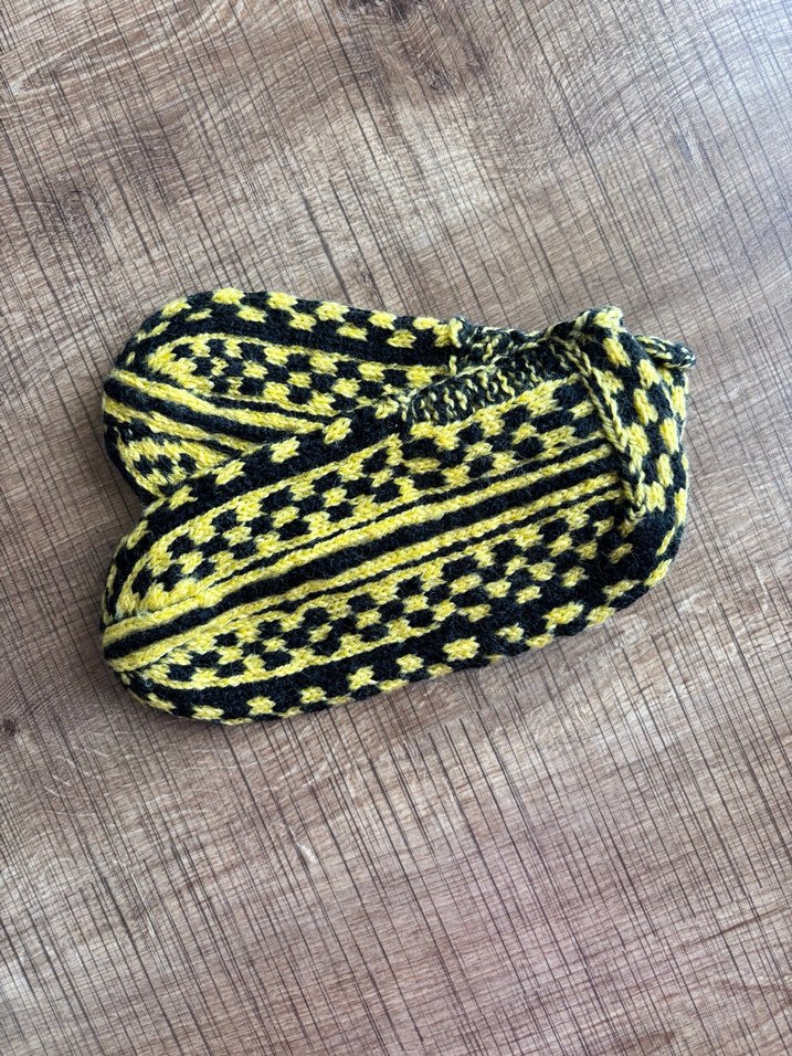 Örgü erkek ev terliği, renkli sarı yılan desenine sahip, rahat ve özgün bir tarz sunar.