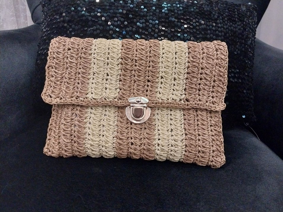 Açık kahverengi örgü kadın portföy çanta, işlemeli desen ve gümüş kapama detaylı, rahat bohem tarzını yansıtıyor. Günlük kullanım için uygun.