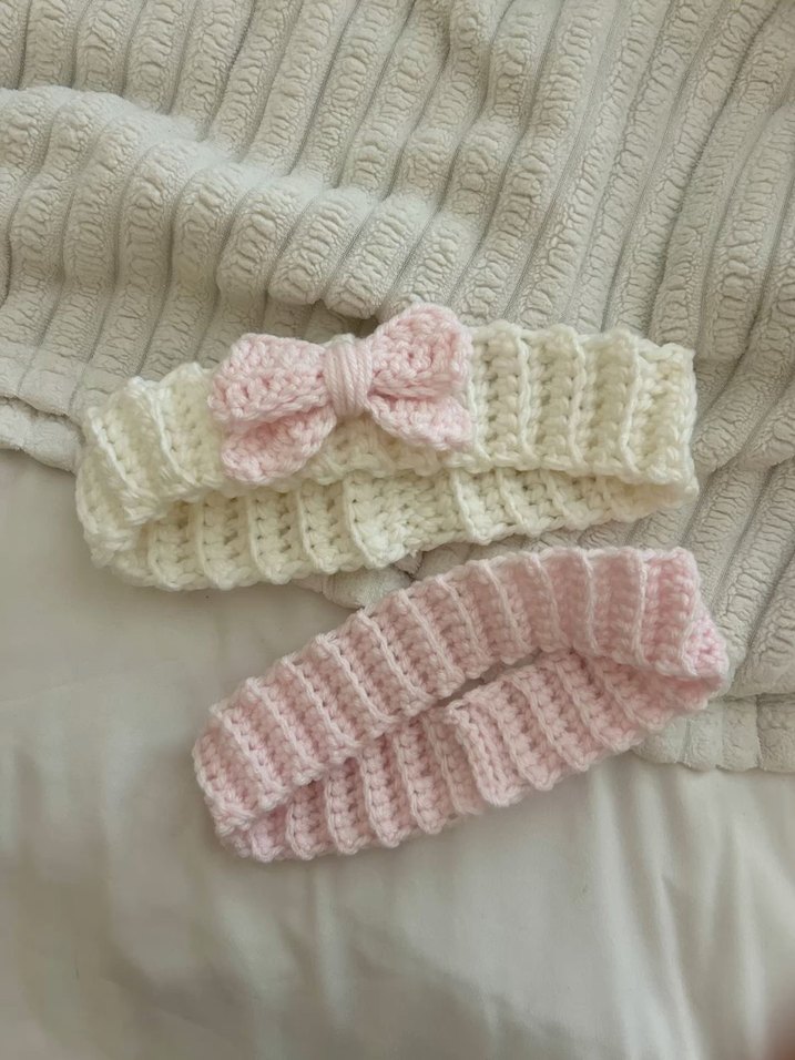 Pastel beyaz ve pembe renklerde, yumuşak örgü dokusuna sahip kadın saç bantları. Birinde pembe fiyonk detayı bulunur, bohem tarzına uygundur.