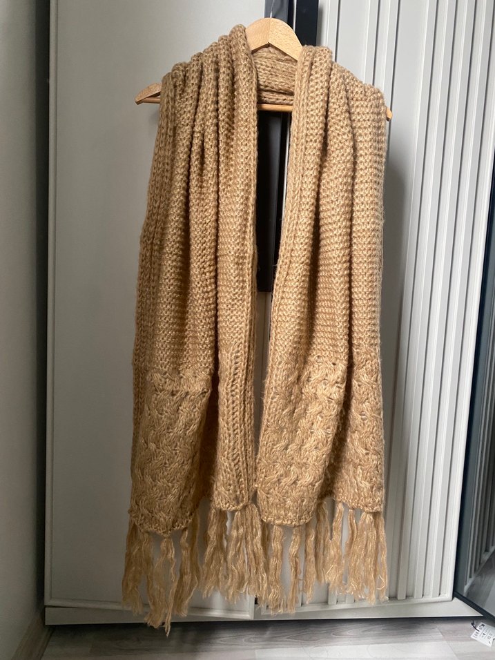 Yumuşak örme kumaştan yapılmış, örgü kadın şalı. Rahat salaş ve bohem tarzıyla retro ve hippie görünümlere uygundur.