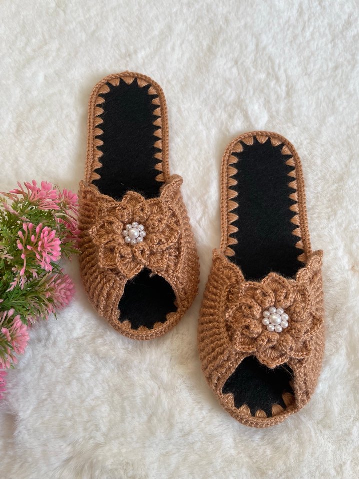 Bej renkli, örgü kadın terlikler, çiçek desenli ve dolgu topuklu, gündelik kullanıma uygun bohem tarzda.