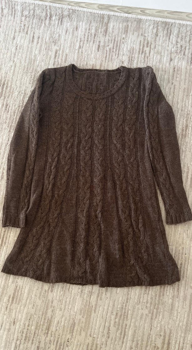 Kahverengi örgü kazak, uzun kollu ve yuvarlak yaka ile rahat ve bohem bir tarz sunar. Günlük kullanım için uygundur.