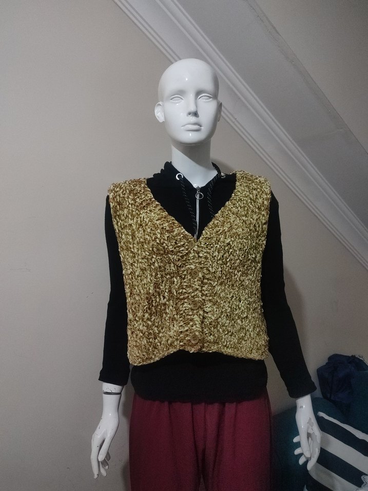 uzun değil kısadır bu nedenle mankene giydirdim örnek olarak görmeniz için iplik modeli kırçıllıdır ilmek kaçması yoktur model olarak genişleyip acilabildiginden öyle gözükebilir kusuru yok 4 adet düğmesi var. manken üzerinde yalnız yelek fiyata dahildir