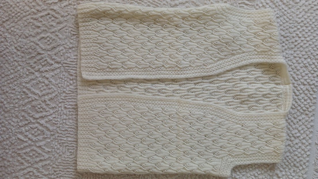 Tarz, kayık yaka ve askılı kolları olan, yumuşak örgü kumaştan yapılmış, krem renkte, kadin el Örgüsü ceyizlik yelek