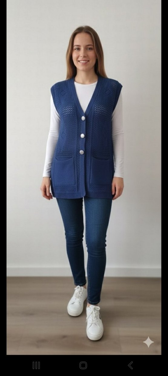 Mavi renkte, V yaka ve düğmeli, iki ön cepli triko yelek. Regular fit, günlük kullanıma uygun, kolsuz ve midi uzunlukta.