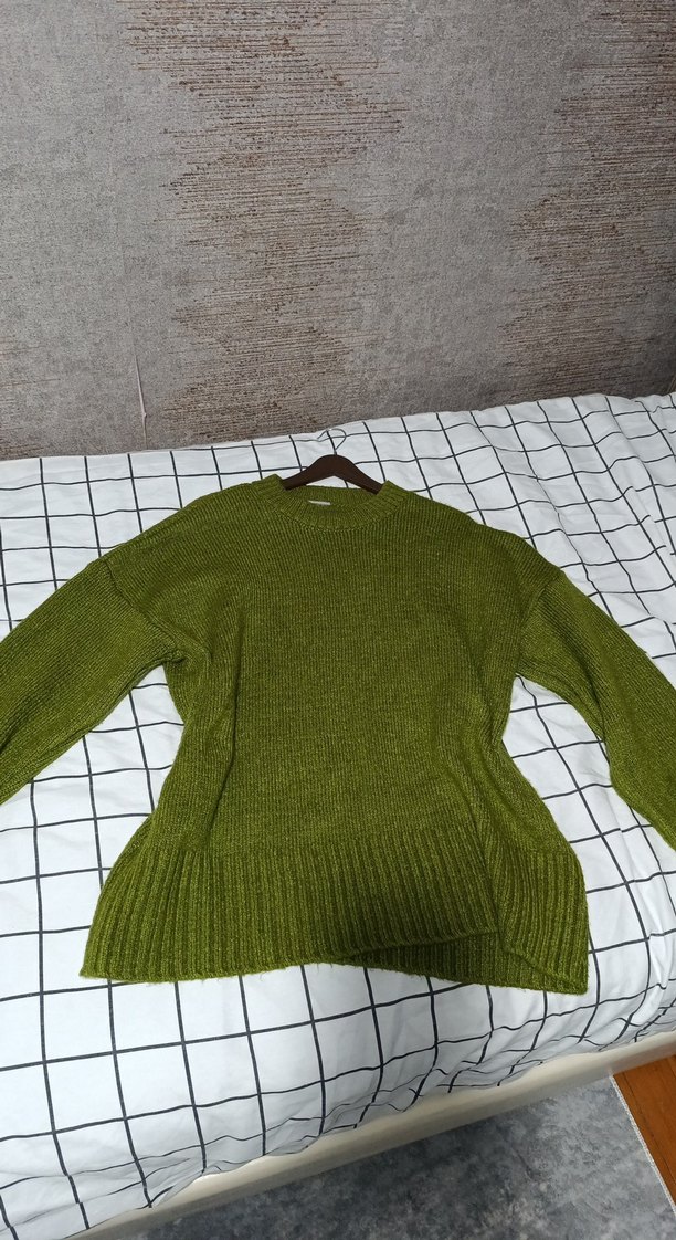 Örgü, yeşil renkli, bisiklet yaka ve uzun kollu, bol kesim kadın kazak. Normal midi boyda, desen içermeyen rahat tasarıma sahiptir. standart beden çok bol geldiği için satıyorum bir kere giydim