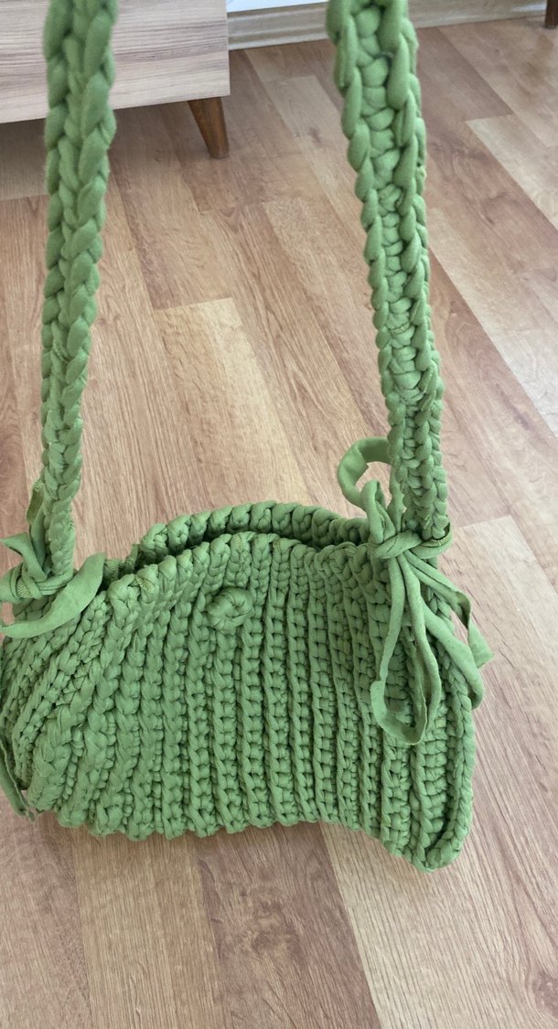 Yeşil renkli, yumuşak örgü kumaştan yapılmış, bohem tarzda kadın çantası. Örgü saplarıyla rahat ve retro bir görünüm sunar.