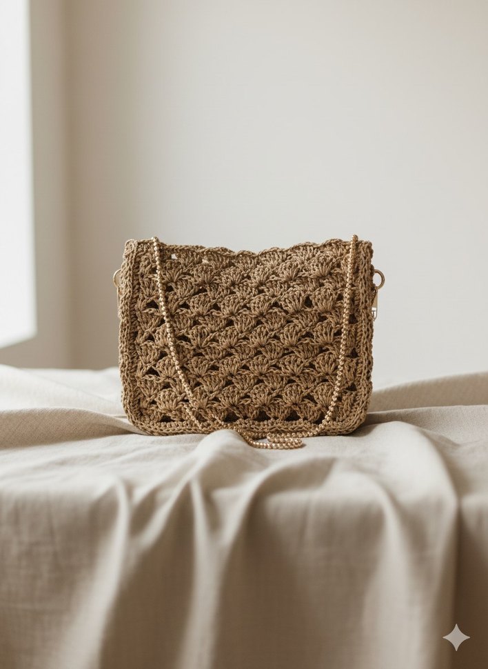 Bej renkli, dantel detaylı örgü kadın çanta, zincir askılı ve minimal bohem tarzına uygun, hafif ve desensiz tasarıma sahiptir.