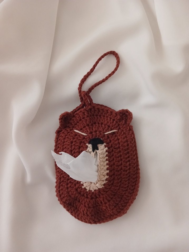 Askılı, kahverengi örgü ayı şeklinde kedi aksesuarı. Renkli detaylara sahip, mendil veya küçük eşyalar için kullanılır.