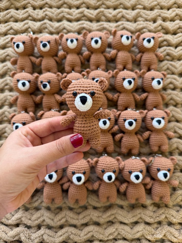 Örgü kahverengi ayıcık anahtarlık, sade ve rahat tasarıma sahip. Yumuşak dokusu ve renkli detaylarıyla dikkat çeker.