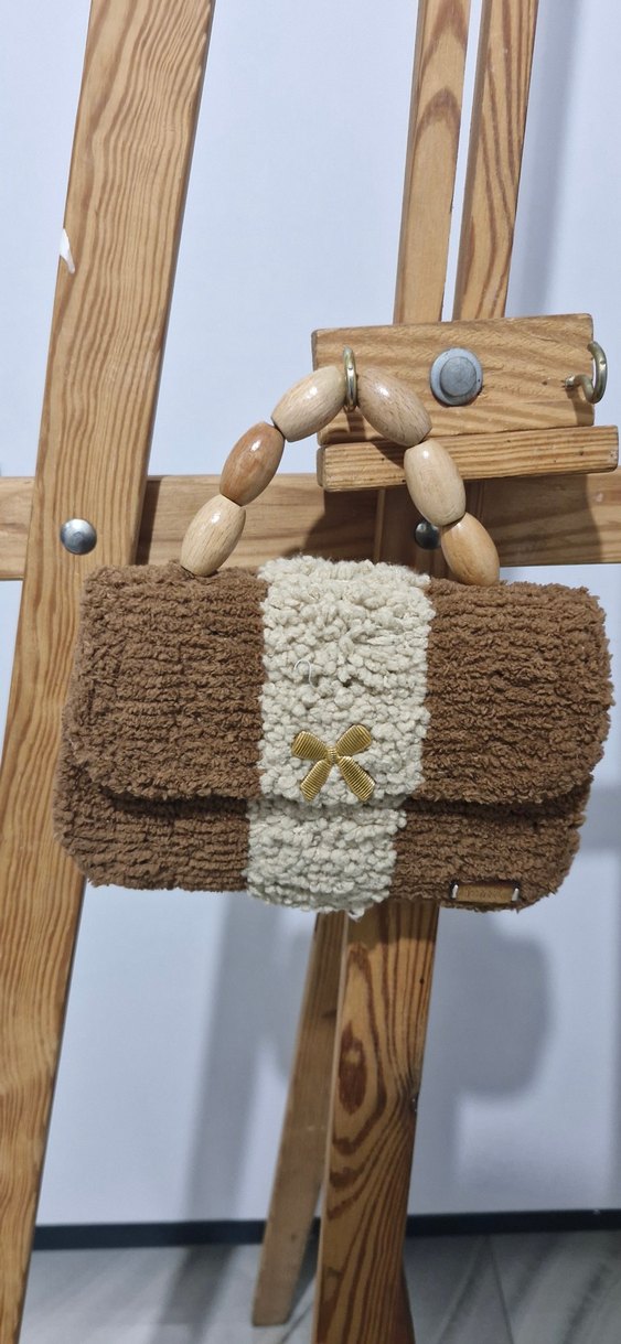 Örgü dokulu, açık kahverengi bohem stilinde kadın çantasıdır. Ahşap boncuk saplı, rahat ve desen içermeyen tasarımıyla günlük kullanıma uygundur.
