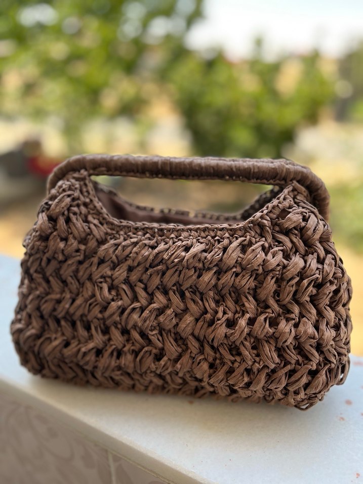 Kahverengi örgü tasarıma sahip kadın çantası, bohem tarzıyla dikkat çeker. Yumuşak örgü malzemesi ve desensiz dokusuyla günlük kullanıma uygundur.