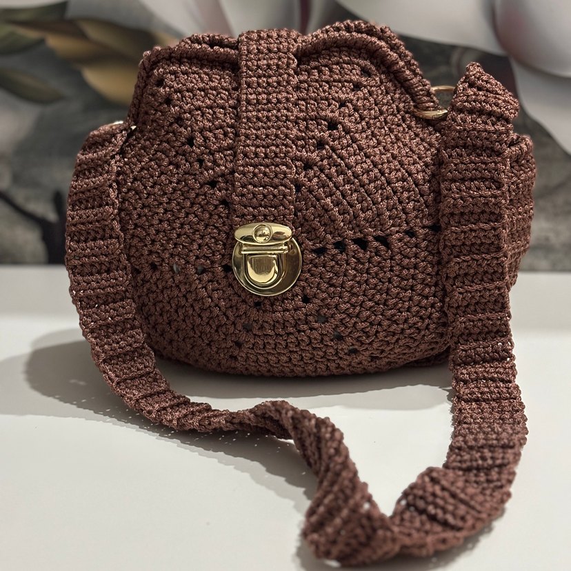 Kahverengi, el örgüsü dokusuyla tasarlanmış, altın renkli toka ve uzun askıya sahip bohem tarzda kadın çantası. İstediğiniz renkte üretilir 3 gün içinde kargolanır.