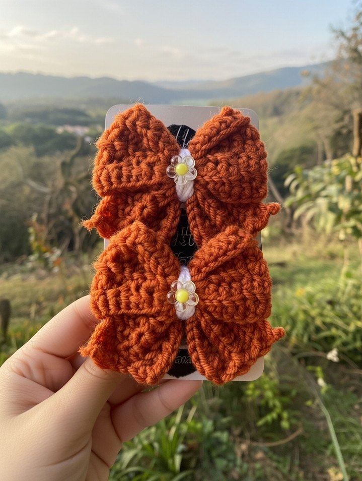 Örgü kahverengi çocuk saç tokaları, renkli nakışlı çiçek detaylarıyla bohem tarzı için uygun.