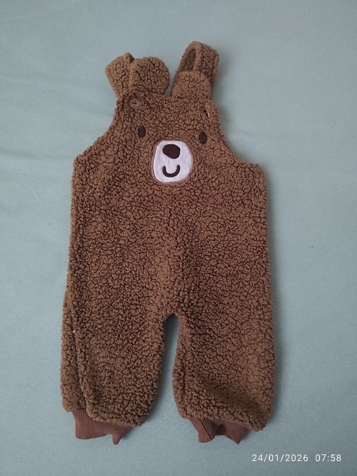 sadece bir düğme eksik 1 yaşına kadar oluyor.Yumuşak ve sıcak dokulu, örgü kahverengi erkek bebek tulumu, ayı yüzü detaylı. Rahat ve desensiz tarzda.